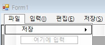 위 사진은 VIsualStudio 의 파일 메뉴이며, Ctrl+S 와 같은 단축키가 ShortCut 입니다. 할당을 하려면 MenuStrip 혹은 ToolStrip을 추가 합니다.