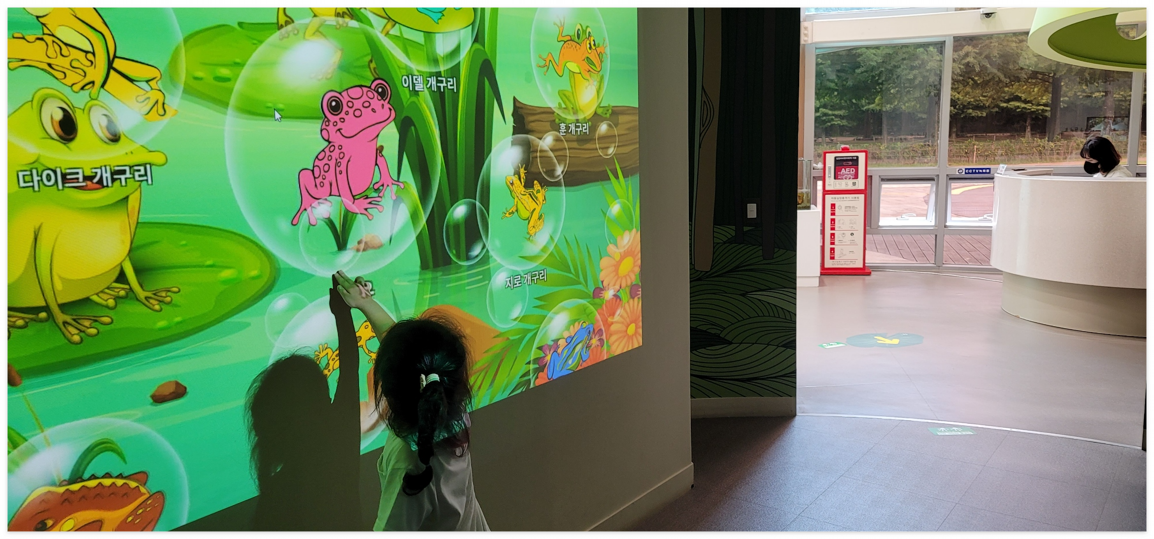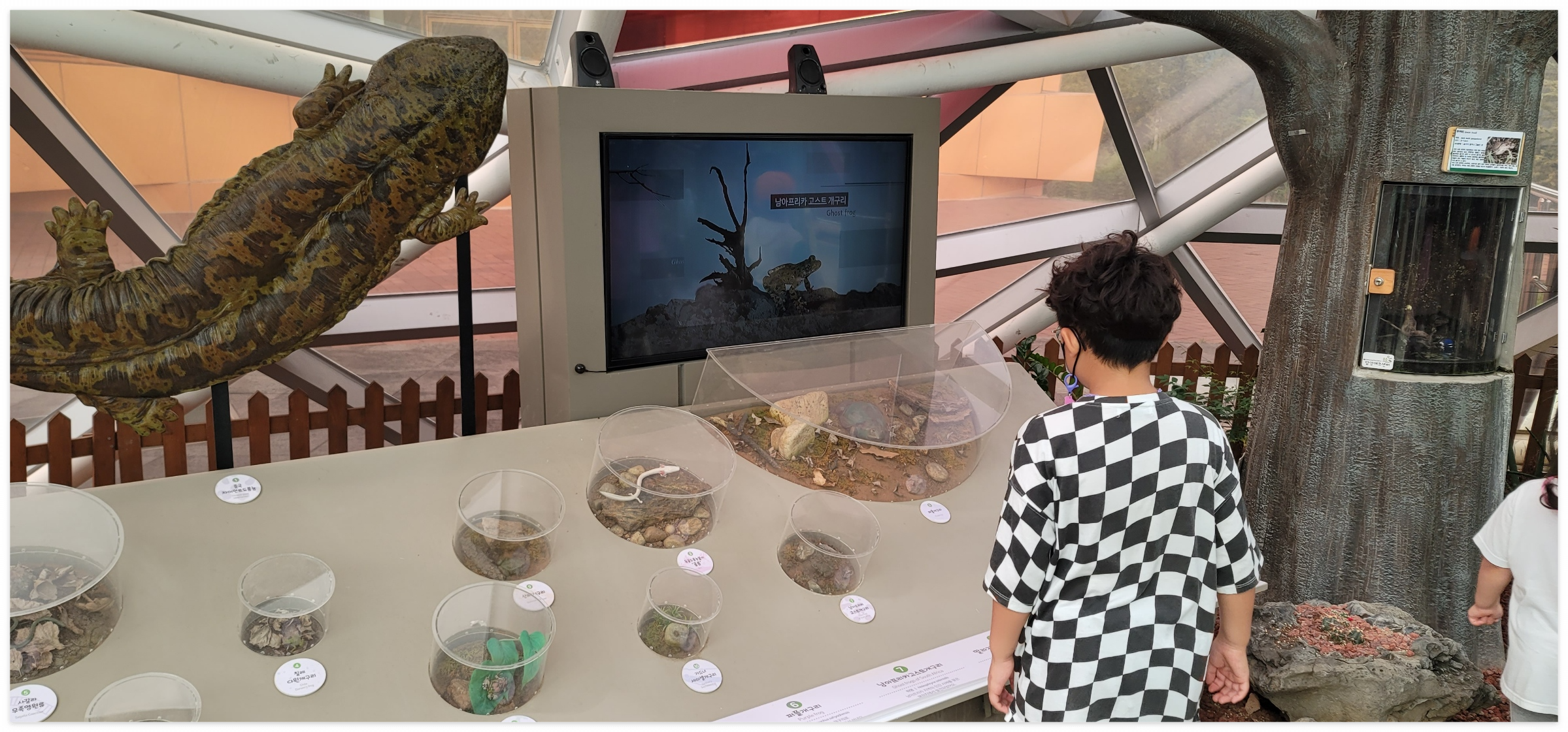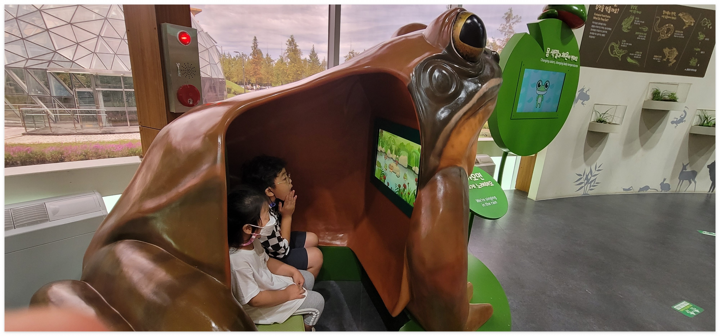 개구리 관련한 정보가 모니터에 표시되요. 딱 둘이 앉으면 꽉 차네요; 공조가 되어 있어서 크게 덥지는 않았어요