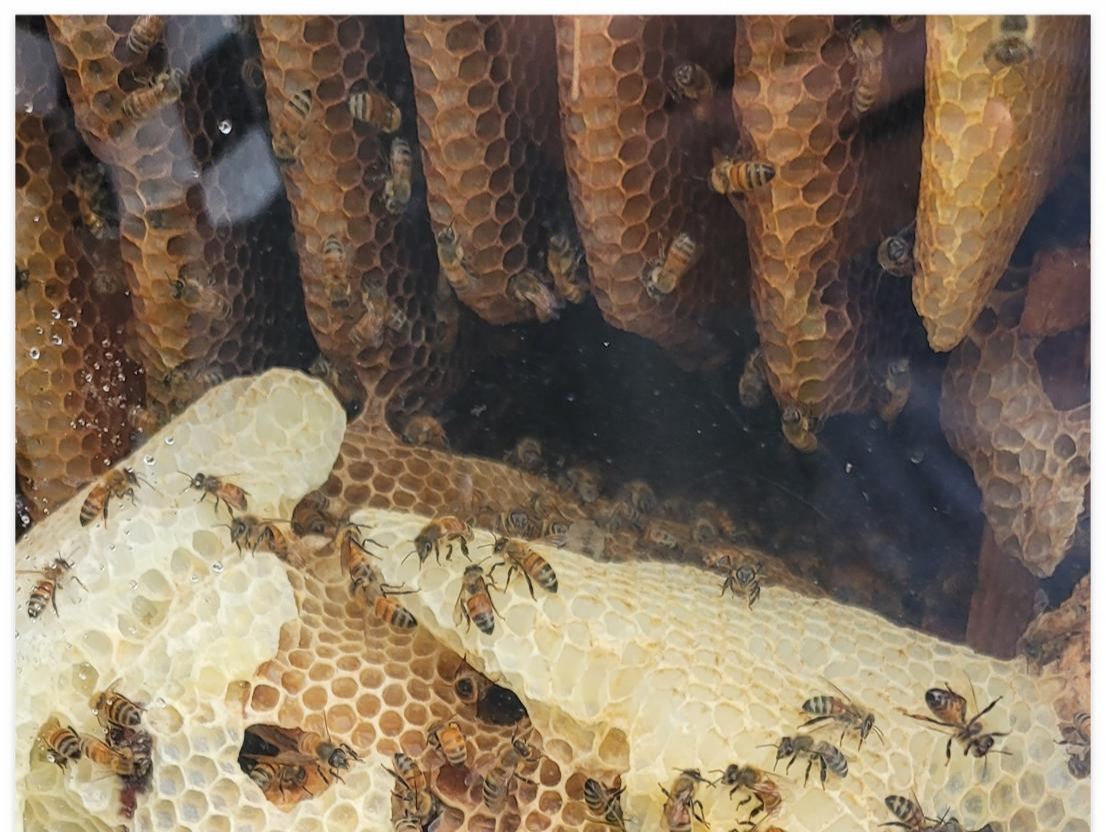 실제 벌들이 살고 있늘 벌집! 밖으로 관이 연결되어 자유롭게 이동을 할 수 있게 되어 있습니다.
